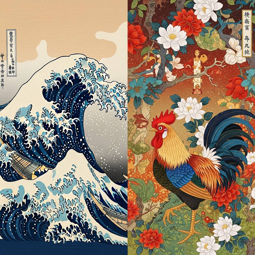 3. 「富嶽三十六景」のダイナミズムと「鶏」の超絶技巧:世界が認める二大巨匠の表現力