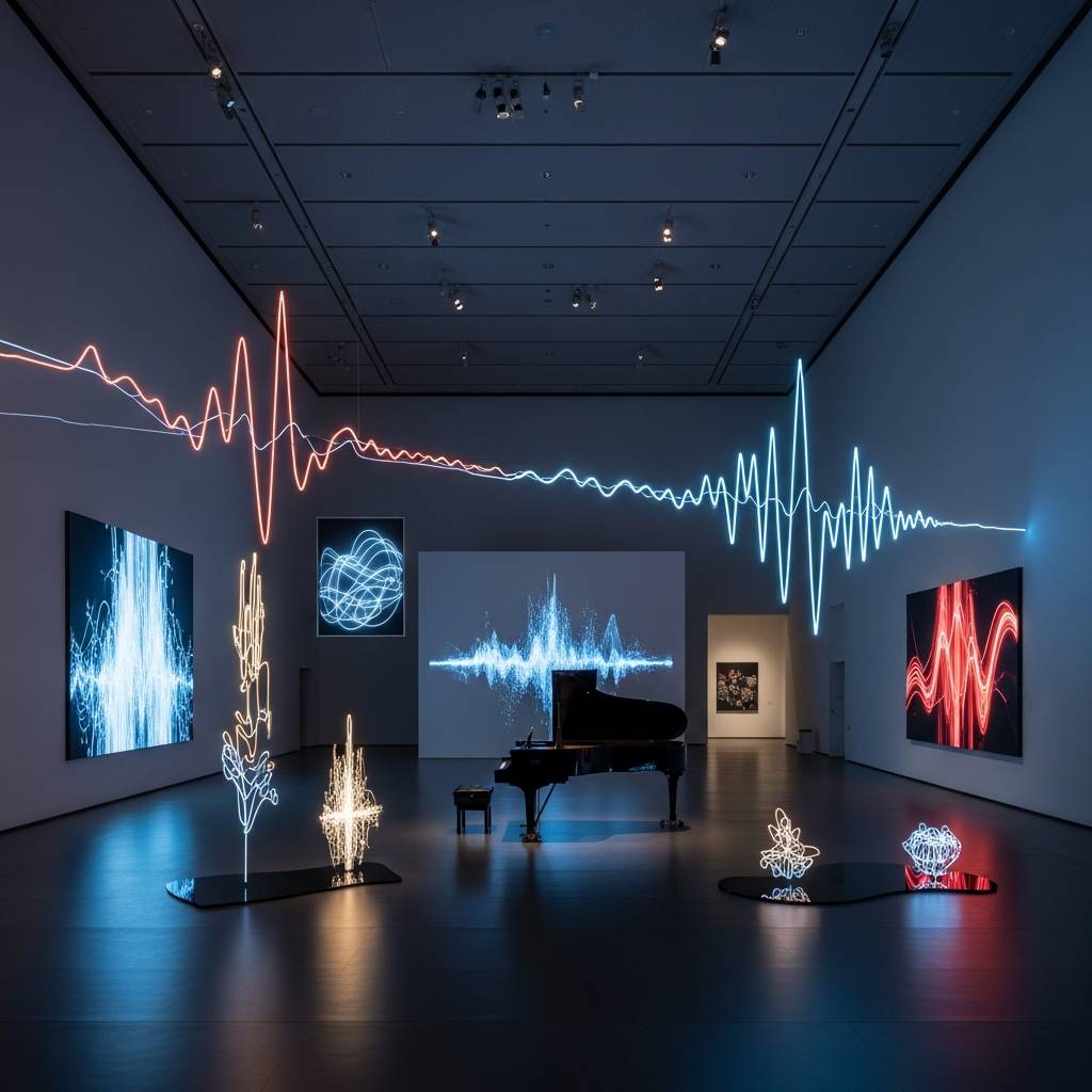広大な展示室に一歩足を踏み入れると、そこは単なる絵画や立体作品が整然と並ぶ場所ではなく、音と光、そして物質が共鳴し合う一つの壮大なインスタレーション空間へと変貌を遂げています。電子音とアコースティックの響きが精緻に織り交ぜられた名曲の数々が、前衛的な映像作品や空間芸術の魅力を最大限に引き出し、私たちの五感を強烈に刺激します。